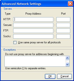 These settings are for network connections. Press the Network Settings... button to get the Network Settings dialog. There are four choices: