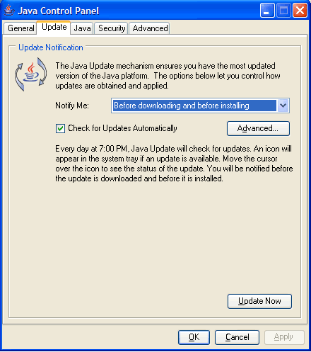 If you select automatic update, you can then set the notification via the Notify Me: drop-down menu, and you can set the update schedule via the Advanced... button.
