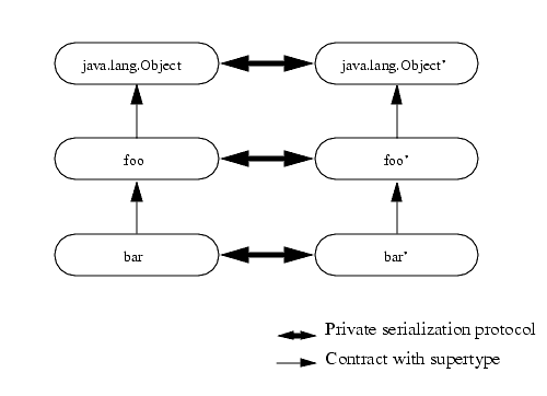 For the purposes of the discussion here, each class implements and extends the interface or contract defined by its supertype. New versions of a class, for example foo', must continue to satisfy the contract for foo and may extend the interface or modify its implementation.