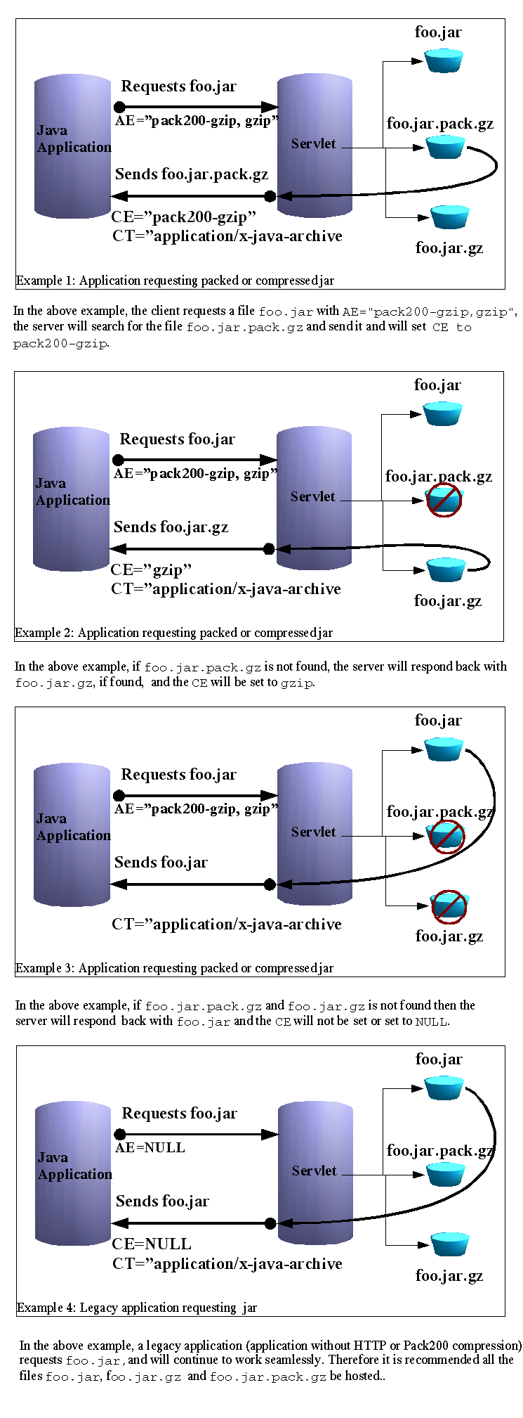 The above can be achieved using a simple servlet or server module with any HTTP 1.1 compliant web-servers. Compressing files on the fly will degrade server performance, especially with Pack200, and therefore not recommended.