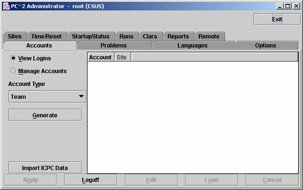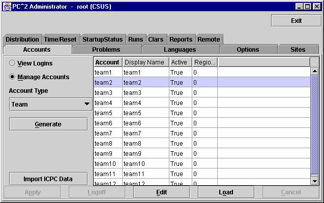 [23] Recall that by default, account passwords are the same as the account name.  However, if  the scoreboard account password(s) are not changed by the Contest Administrator, it would mean that any team could start a scoreboard running on their own machine, allowing them to look at the contest standings even during times when the Contest Administrator has decided to hide that information (such as near the end of the contest, which is the policy in some contests).  We strongly recommend changing the scoreboard account passwords.