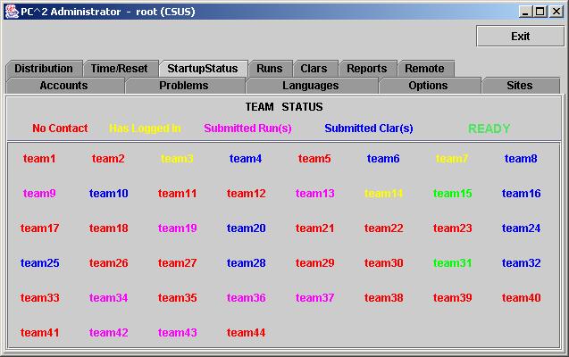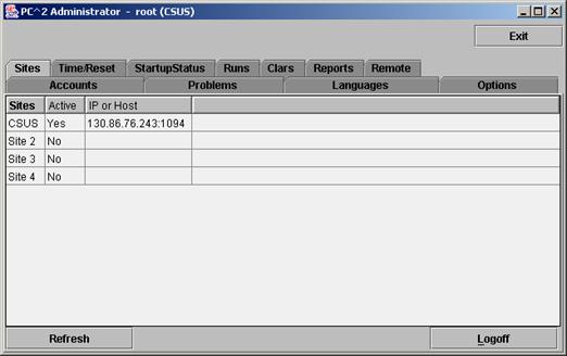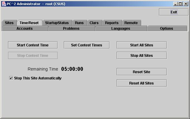 [17] If a new site server is started after the Start All Sites button is pressed, it will be necessary  to use an Admin client logged in to that new site to start the contest time for that site.  Alternatively, you could use Stop All Sites then Start All Sites to start all sites including the new site;  but this will cause all Clients/Teams to be unable to submit runs or clarification requests during the (brief) time between the Stop and Start.