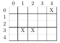 Input will consist of multiple test cases. Each test case begins with two positive integers, m and n, defining the number of rows and columns of the patch of earth. Rows and columns are numbered starting at 0, as in the figures above. Following these is a non-negative integer r indicating the number of rocks, followed by a list of 2r integers denoting the row and column number of each rock. The last test case is followed by a pair of zeros. This should not be processed. The value m x n will not exceed 625.