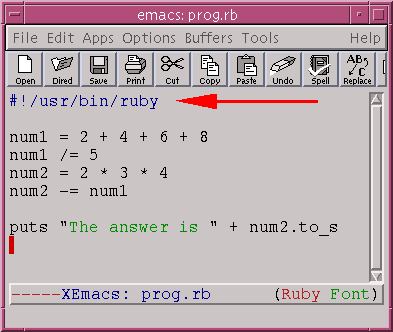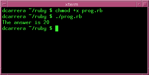 Now you can type 'chmod +x prog.rb' to make the program executable ('+x' means "executable").